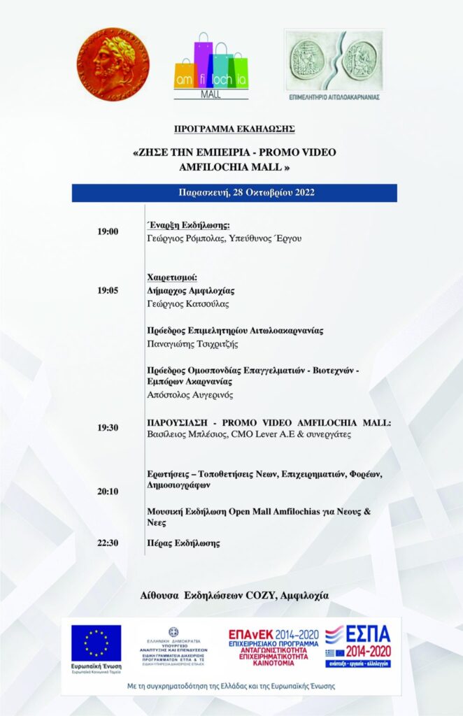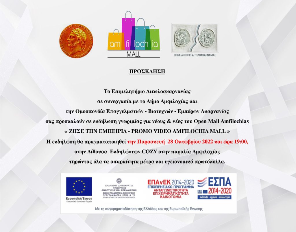 Introduction event for young men and women of the Open Mall Amfilochias, “LIVE THE EXPERIENCE – PROMO VIDEO AMFILOCHIA MALL” on Friday, October 28, 2022 at 19:00 at the COZY Event Hall on Amfilochia beach.